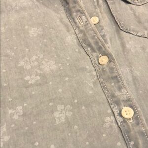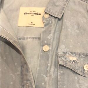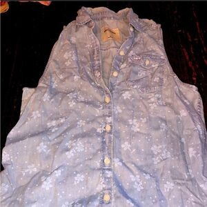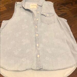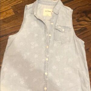 Light Wash Sleeveless Denim Button-Down with Floral Print. This stylish sleeveless button-down shirt from Abercrombie & Fitch comes in a light wash denim with a subtle, all-over floral or leaf print. It features a classic collar, a full button-front closure, and a single chest pocket with a button flap. Perfect for a casual, breezy, and trendy look!