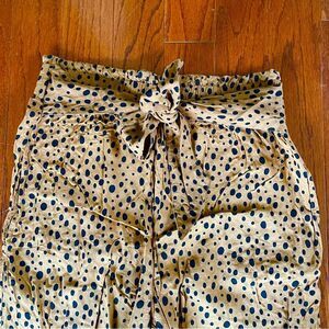 Wide leg pants with elastic waistband and tie front. Dark tan and black animal print pattern. Only worn and washed once. Excellent used condition. Size small.