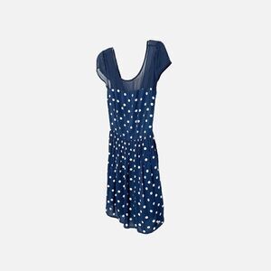 Very good preowned condition. No flaws to note. Body and lining 100% viscose. Shoulders and upper back are semi sheer, unlined, navy. The rest of the dress is polka dots and lined. Moose logo in the lower corner. Elastic waist. Cap sleeves. Hidden side zipper. Low/open back.