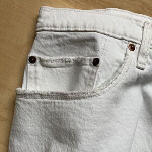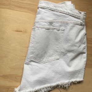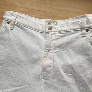 These Abercrombie & Fitch mom shorts are white with a distressed look. Five pockets. Jagged hem. Front zipper. Waist flat across is 24”. Hips flat across is 28”. Front length is 14”. Back length is 17”. 99% cotton. 1% elastane.