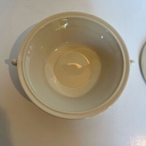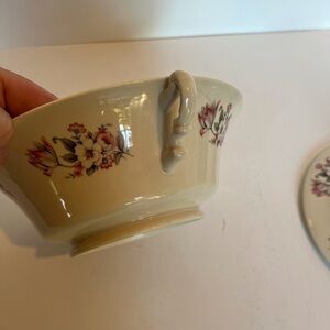 Discontinued piece of Moss Rose China (Smooth Edge, No Trim) Creamy White color with Pink, White and Gray flowers. Excellent condition, no chips, cracks or crazing. H with lid 5.5in x W 10in. A lovely table piece!