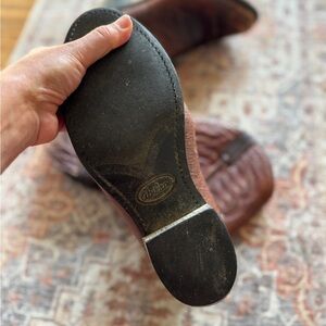 Classic cowboy boots with intricate stitching. Durable leather construction. Perfect for Western style. Still in great condition, no holes or tearing. Good solid boot. Could use some leather conditioning. I just didn't have any on hand.