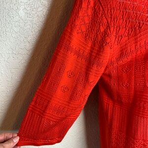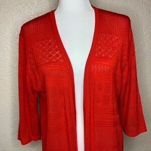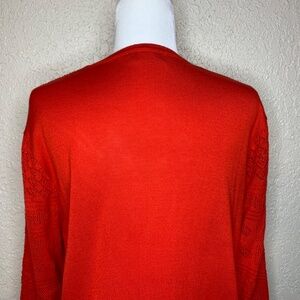 Orange lace Abito sweater cardigan women's size medium. Open front lace cardigan with lace panels and solid back in a fun vibrant orange color. Lightweight and perfect for year-round wear. Sleeves are 3/4 inch and are also lace.