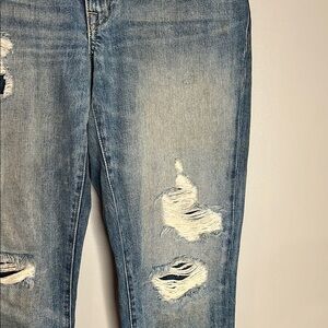 Able jeans with a distressed look. Classic blue denim. Casual and trendy style.