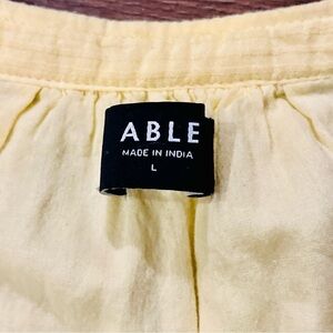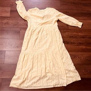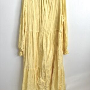 The Able Dress Women’s Jane Maxi Prairie Antique Pockets Tiered Cottagecore Lined in size Large is a beautifully designed piece perfect for the modern woman who appreciates a bohemian, cottagecore style. Made with a blend of viscose and cotton, this long sleeve dress features a Henley neckline and a solid yellow color with a hint of prairiecore charm. The pullover closure and machine washable care make it convenient for everyday wear, whether for traveling or casual outings. Layered accents, along with a lined and stretchy design, ensure comfort and style all year round.