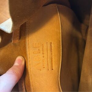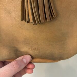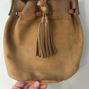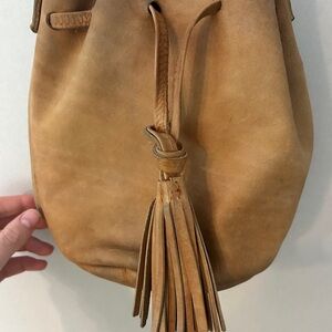 Stylish tan genuine leather crossbody bucket bag. Features a chic tassel accent. Perfect for everyday use. Some wear- just needs some love!