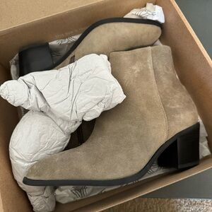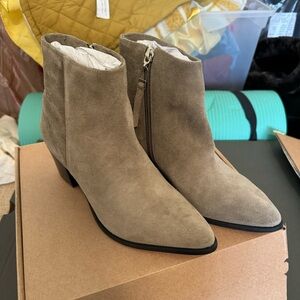 New never worn, waterproof taupe suede. Size 8, but prob fits a 7 or 7.5 better due to pointed toe.