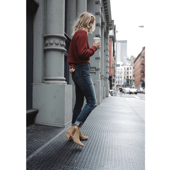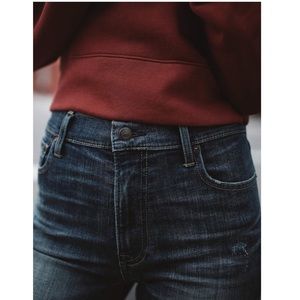A medium dark wash colored with vintage wear and tear holes rips at the knees and a raw edge cuff hem The sleek high rise high waisted fit of this jean paired with the well worn wash make it a favorite