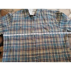 Ably Filium Activated Flannel Shirt Plaid Long Sleeve Blue Green Purple XL, in good pre-owned condition: no holes, no stains, significant wear, pilling throughout, has been recently cleaned, may be stale from storage. Marked as a women's XL, measurements are taken while laying flat and are approximate: (see photos)