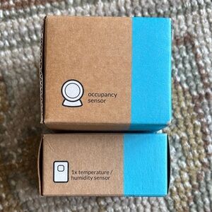 Set of occupancy and temperature/humidity sensors in blue and brown packaging. Brand new.