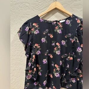 Great condition! Super cute top from Nordstrom. Love the dainty side ruffles and flowers - and black keeps it modern and trendy! SO cute for fall layered with a cozy cardigan, jeans and boots.
