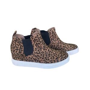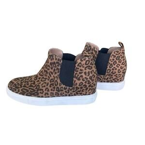 Features- Leopard print, bootie, slip-on, rubber sole, elastic inset, animal print, fabric upper