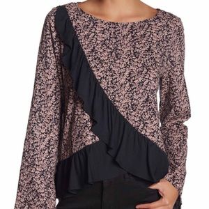 New With Tags- floral print blouse by Abound with boatneck, long sleeves and ruffle high-low hem. 100% Modal. MEASUREMENTS: (XS) Shoulders 14”, Bust 36”, Length 19”- 23”, Sleeve Length 24”. (XXS) Shoulders 13.5”, Bust 36”, Length 19”-23”, Sleeve Length 24”.