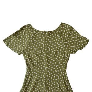 Adorable floral dress by Abound. Featuring a soft green fabric with white daisy prints, a flattering v-neck, and short flutter sleeves. Perfect for spring or summer, this dress offers a flowy fit with a back zipper closure. Comfortable and stylish for casual outings or a day at the park.