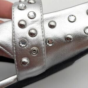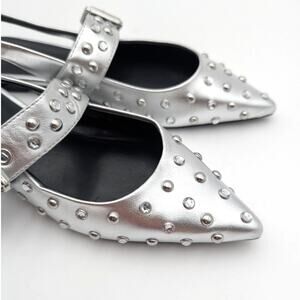 Polished rivets and crystal embellishments draw the eye to this slender flat that's elongated by a pointy toe. Synthetic upper and lining/rubber sole.