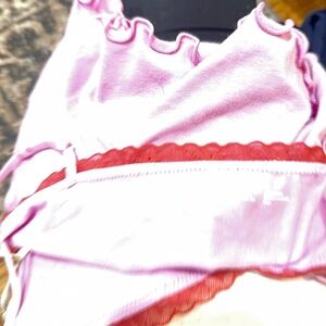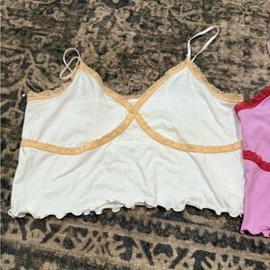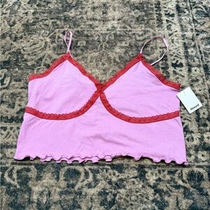 Stylish pink crop top. Features red lace trim. Perfect for casual wear.