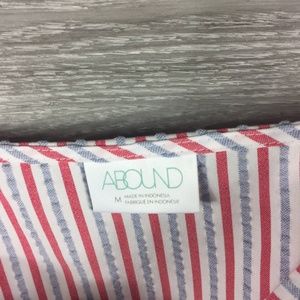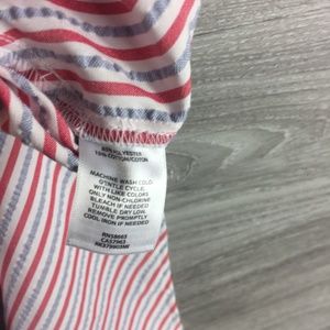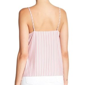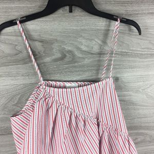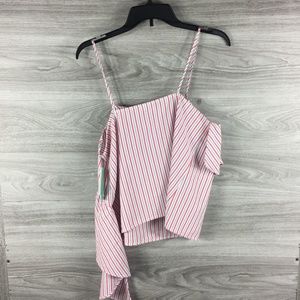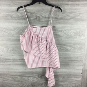 A ruffle panel delicately drapes across the front and cascades down along the side forming an asymmetrical hem on this striped tank top.