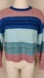 Loose knit pullover sweater has broad striping in blue, teal and mauve colors. Crew neck, long sleeves with dropped shoulders and boxy silhouette.