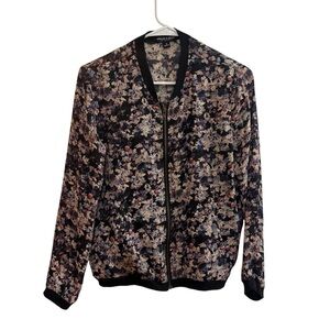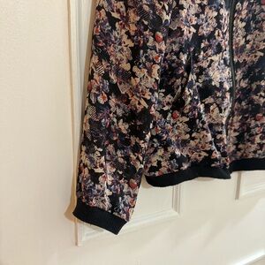 Chic bomber jacket with a floral pattern. Features a sleek black base. Ideal for casual outings.
