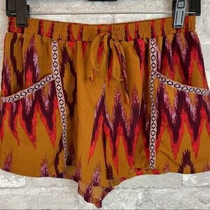 About a girl bold print shorts Front pockets Drawstring elastic waistband Inseam- 2 1/2” Mid rise sits above the hip Contrast trim B21