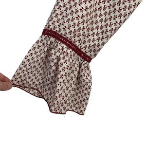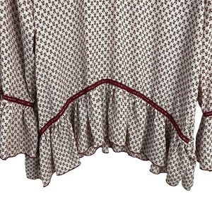 Elevate your casual style with this stunning About A Girl Red and White Peplum Floral Blouse. The blouse features a V-neckline, long bell sleeves, and pullover closure. The floral pattern adds a touch of elegance to the blouse while the lace detailing provides a subtle and feminine touch. Crafted from lightweight polyester, this blouse is perfect for all seasons. It's an ideal addition to your wardrobe that can be styled up or down for any casual occasion. The blouse is machine washable and comes in size XL. Add this beautiful blouse to your collection today.