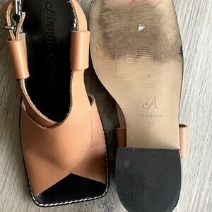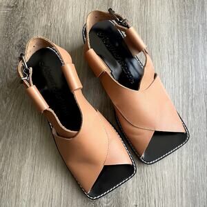 the about arianne kai canela is a strappy heeled sandal made of brown cotton fabric. these sandals feature a square toe with straps across the vamp and ankle with a metallic buckle and an arquitectural 45mm heel. the sole is made of vegan resins.