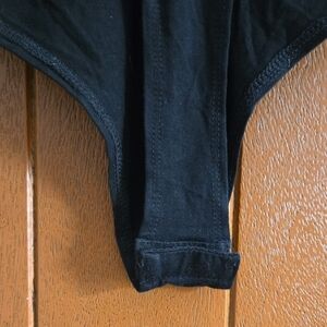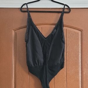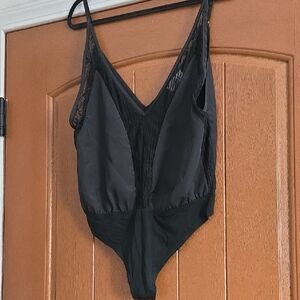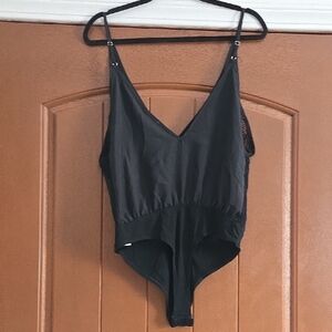 Elegant black lace bodysuit with sheer details. Perfect for layering or wearing alone. A6