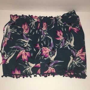 About a Girl Los Angeles Pompom Bird of Paradise Print Shorts Size L EUC Dark emerald green background with orange and purple flowers. Elastic waist Flat lay measured waist unstretched 14” Inseam 2” side length 12” Rise 12”