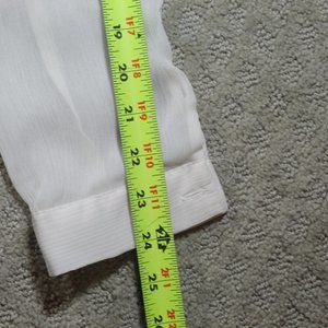 Great Y2K blouse in great condition. This cream colored sheer blouse buttons down the front and has rolled sleeve buttons to hold the roll. Great pre-owned condition - it has one very small pull on the top left across the shoulder blade area. See the last picture. I had to really zoom in because it is very hard to see.