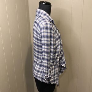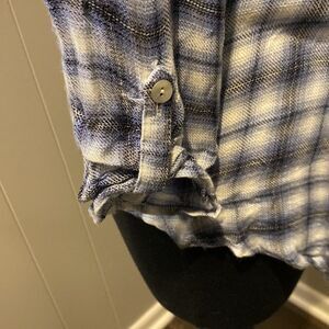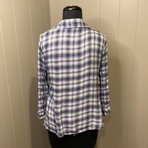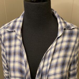 About a Girl Small Open Long Sleeve Shirt Cardigan Plaid Blue/White Uneven Hem. Button Cuffs.