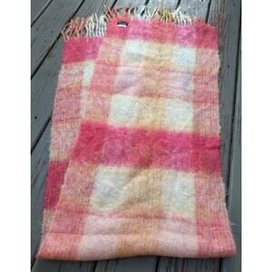 Great vintage condition 100% mohair blush coral orange yellow pastels plaid fringed scarf large size