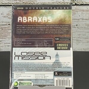 A DVD double feature presenting two action-packed films. This DVD includes "Abraxas," starring Jesse Ventura as an intergalactic alien police officer tasked with tracking down and apprehending a renegade alien, complicated by a pregnant woman carrying a potentially destructive child. The second film, "Laser Mission," features Brandon Lee in a race between the CIA and KGB to locate a renowned scientist in Cuba who holds the key to constructing a laser cannon from a stolen diamond.
