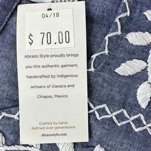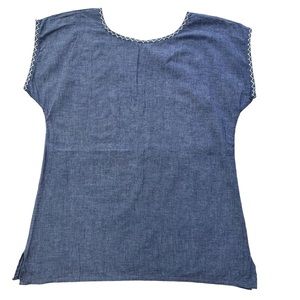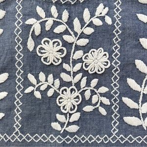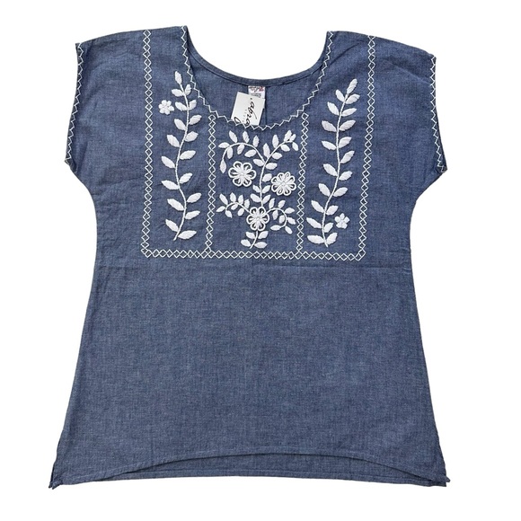 Abrazo Rococo blue top with a white embroidered floral design. 100% Cotton. Handcrafted in Mexico.