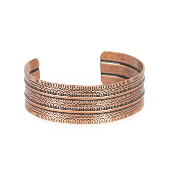 Stamped in tribal-inspired patterns, an antiqued copper cuff wraps around the wrist for an indigenous look