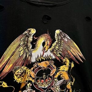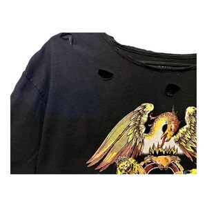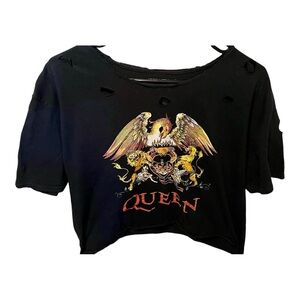 Black with Queen Classic Crest Logo. Hand cropped and distressed, under neckline, it’s been altered to look torn. Approximate Measurements: Pit to pit:’23 Length:’22. No Stains. Smoke Free Home. No Further Discounts. As low as I can go and still offer a shipping discount.