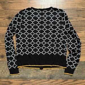 Absolutely Creative Worldwide women’s cardigan in size large featuring a modern black and white geometric ring pattern. Button front closure with ribbed hem and cuffs, accented by a subtle mustard yellow trim along the bottom. Soft, lightweight knit material made in the USA. Great preowned condition with no visible flaws — stylish and easy to layer year-round.