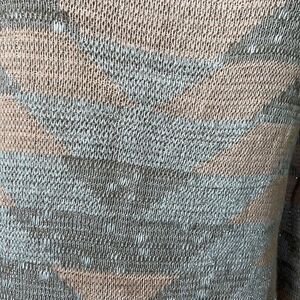This sweater is incredibly lightweight and airy. It has pink, tan and gray colors with beautiful flecks of metallic silver throughout the fabric. It has ribbed material on the bottom and ends of sleeves. The only flaw is a tiny pull on the sleeve. Amazing condition otherwise!