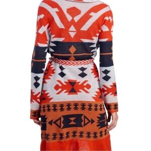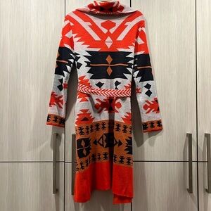 Details: Striking Aztec pattern, belted waist, duster length, pockets