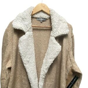 Soft and cozy camel knit with Sherpa trim. Waterfall front. Front patch pockets.