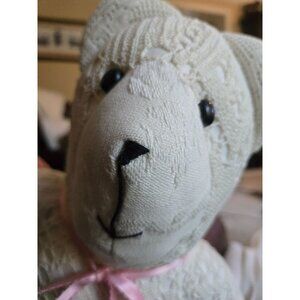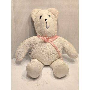 This adorable cream-colored bear is crafted with delicate cotton lace and ribbon patchwork, making it a perfect gift for weddings, babies, or as a cherished heirloom piece.
