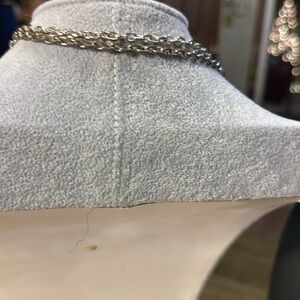 Silver necklace bought at Neiman Marcus absolutely gorgeous. It can be doubled up or worn as one long chain with the silver chain at the bottom in a knot. It’s beautiful the dimensions of this necklace. The length of the necklace is 18 inches.