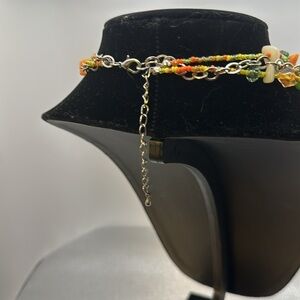 Absolutely beautiful necklace for springtime and summer. The beads are glass and some acrylic. The length of the chain is 16 inches.