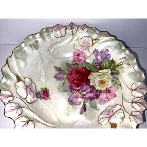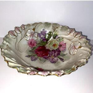 This bowl is absolutely gorgeous; it has one little chip on the bottom edge (see pic) not noticeable at all until turned over; I cannot make out the stamp on the bottom but it may say PS Germany; the bowl itself measures a large 10" across 4" deep. The roses are absolutely incredible; there are flowers done in relief on the inside; maybe pansies; gold edged paint - this is one of the best. Perfect for your Shabby Chic cottage home. I have a lot of incredible things listed; be sure to take a look.