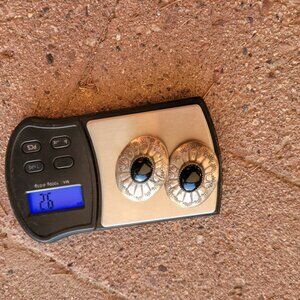 These are absolutely fabulous! Wonderful polished deep black oval onyx cabachons sawtooth bezel set in 925 sterling silver. Surrounded by exquisite hand stamp work. No stamps as typical of older Native American pieces. Natural, beautiful patina included. May need a cleaning depending on your preferences. Tested with a neodymium magnet and JSP acid, guaranteed sterling.