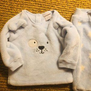 Plush, baby blue set with white stars. Very good condition. 3-6m. By Absorba.