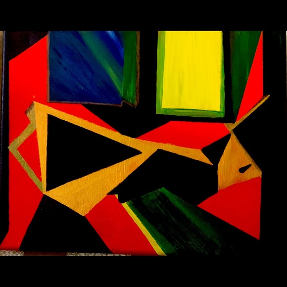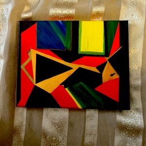 Beautiful abstract with origami shapes painted with bright bold colors orange,green,bronce gold and black. Signed by artist this is an original art piece . You can see what it looks like when you frame it very beautiful. Frame not included