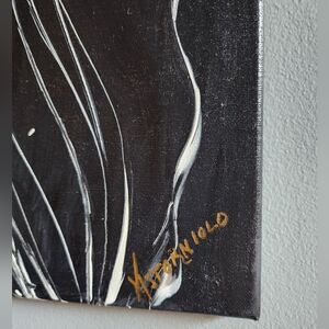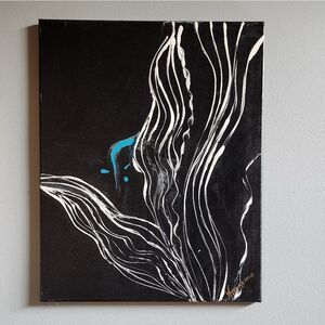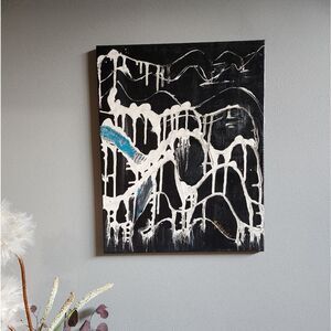 Enhance your space with this striking abstract canvas art. Featuring bold black and white patterns with a touch of blue, this piece adds a modern flair to any room signed by the artist.