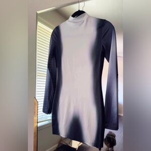 Unique long sleeve dress with an abstract body print. Features a striking black and white design.