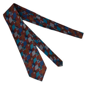 - Abstract checkered tie with hints of burgundy, orange, blue and teal