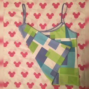 Cropped tank top with spaghetti straps. A bit faded, but still super cute. Size large, but the fabric is stretchy enough to fit as an XL.